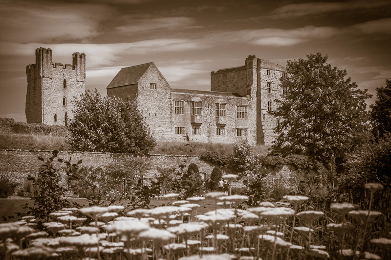 This view is from the walled garden and contrasts the softness and organic forms of the trees and flowers with the stark, harsh and rugged lines and textures of the castle and manor house.