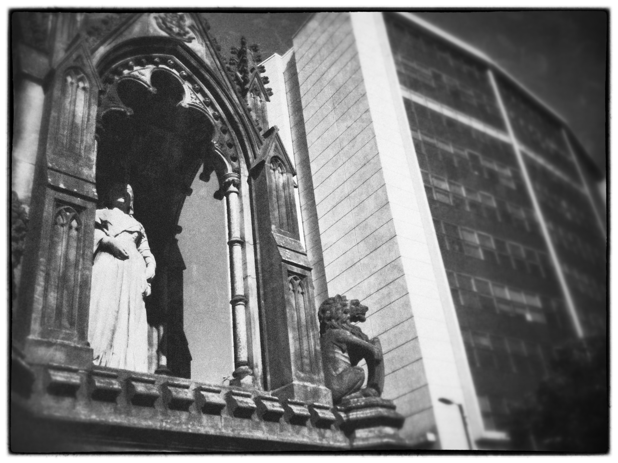 I was struck by the odd juxtaposition of these two objects and thought it would make an interesting image. The Empress of India Queen Victoria enveloped in Gothic stone masonry alongside a 2oth century, bland, uninspiring block of a building. I shot this on an iPhone and processed the picture in Snapseed.