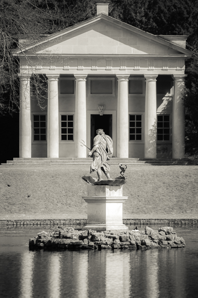 Neptune watching the comings and goings at the temple at the reflecting ponds at Studley Royal Estate near Ripon, North Yorkshire. Mono conversion finished with a very light sepia tone in the highlights.